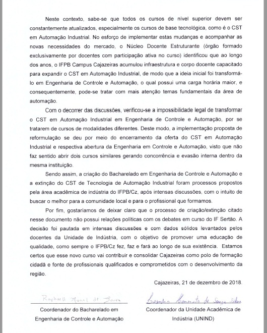 O professor Daladier Júnior contestou a informação prestada pelo reitor dando conta que “os investimentos em outra unidade só se justificam em função da realização de estudos que comprovem a impossibilidade de crescimento da oferta dentro da estrutura existente”, ou seja, a unidade atual atende a demanda de cursos em Cajazeiras, segundo Nicássio.