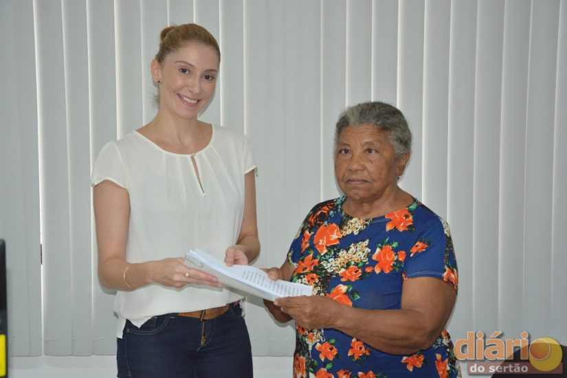 Promotora do Meio Ambiente recebeu o documento das mãos de dona Maria Auxiliadora da Silva, de 76 anos, que na infância tomava banho no açude