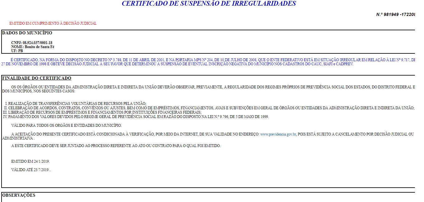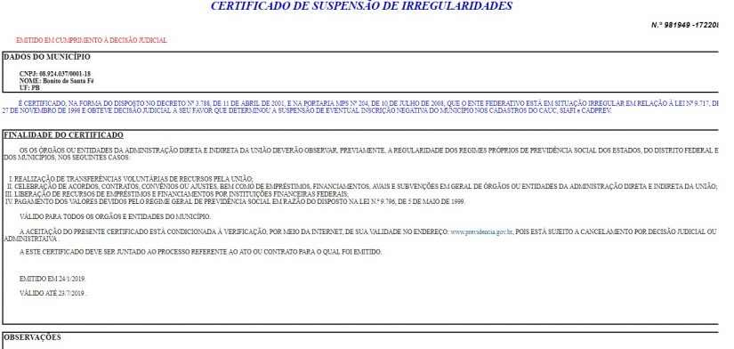 Para conferir o Certificado de Suspensão de Irregularidades, acesse: