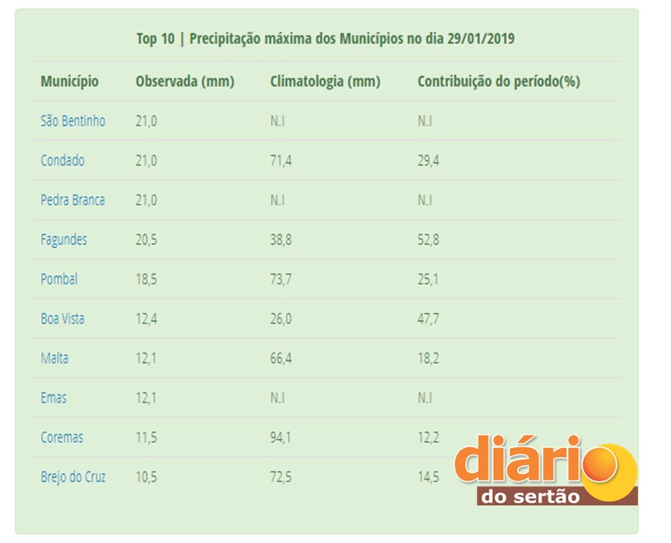 As cidades com maiores registros de chuvas foram Coremas, que registrou cerca de 94,1 mm, Pombal com 73,7 mm e Brejo do Cruz com 72,5 mm.