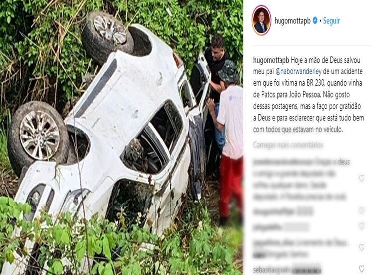 “Hoje a mão de Deus salvou meu pai @naborwanderley de um acidente em que foi vítima na BR 230, quando vinha de Patos para João Pessoa. Não gosto dessas postagens, mas a faço por gratidão a Deus e para esclarecer que está tudo bem com todos que estavam no veículo.”