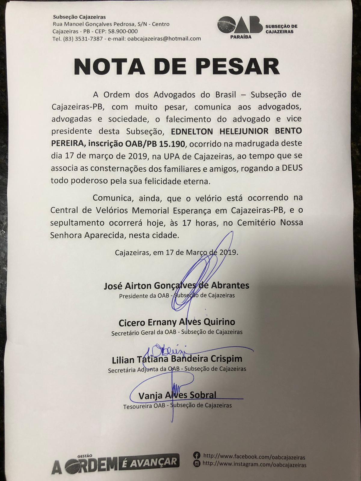 Faleceu na madrugada deste domingo (17), em Cajazeiras, aos 37 anos, o advogado Ednelton Helejunior Bento Pereira, mais conhecido como Júnior Bento, vice-presidente da OAB Subseção de Cajazeiras. Ele passou mal e foi encaminhado para a Unidade de Pronto Atendimento (UPA), mas não resistiu e faleceu, provavelmente vítima de infarto.