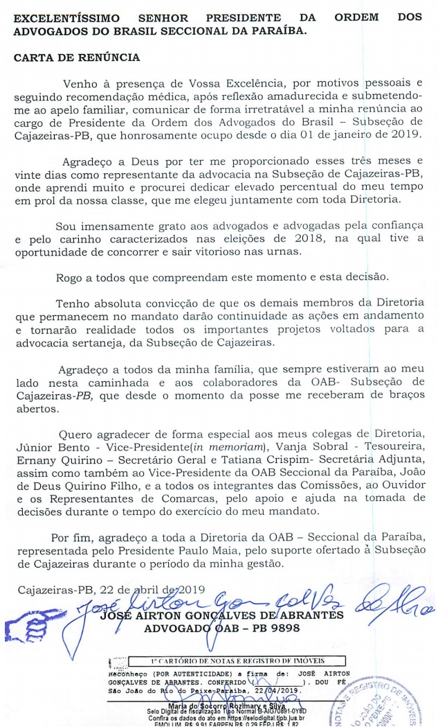 Em carta datada de 22 de abril de 2019, endereçada e protocolada junto à OAB – Seccional da Paraíba, o advogado José Airton Gonçalves de Abrantes (Airton Abrantes) renunciou ao mandato de presidente da Subseção de Cajazeiras.
