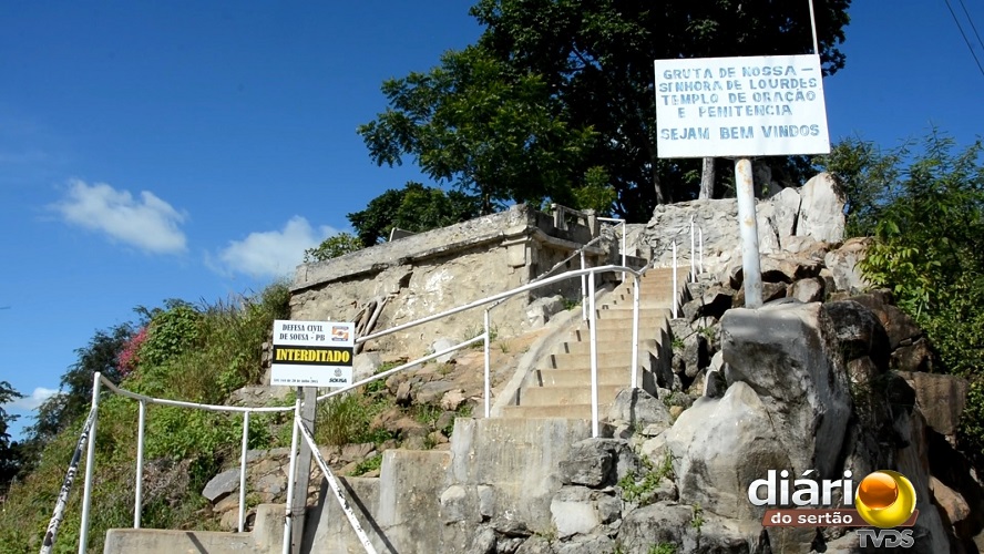 Às margens da rodovia estadual PB-384, no distrito de São Gonçalo, município de Sousa, um ponto turístico está completamente abandonado. Ao lado da placa que convida os fiéis à oração tem um aviso de interdição da Defesa Civil.