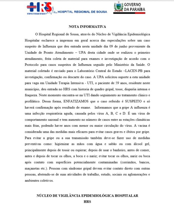 A direção do Hospital Regional de Sousa divulgou nota sobre o caso:
