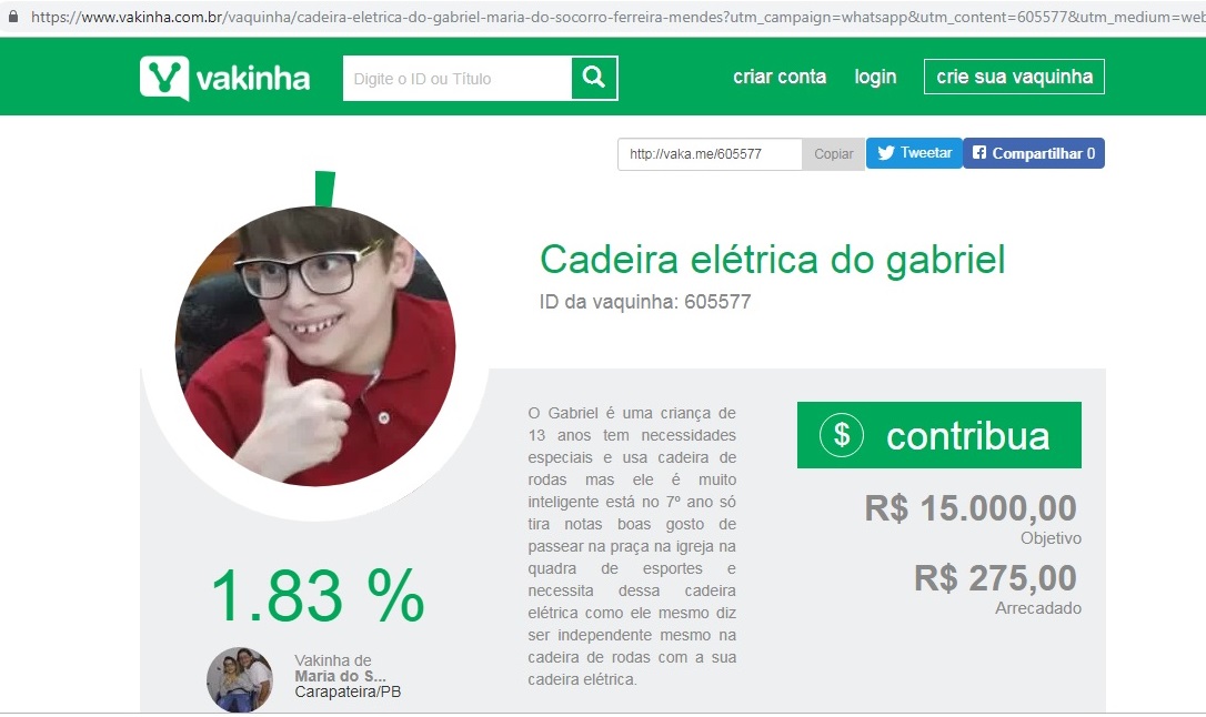 O pequeno Gabriel Ferreira, 13 anos de idade, natural da cidade de Carrapateira, Sertão da Paraíba gravou um vídeo para fazer um apelo nas redes sociais. Ele é portador de necessidades físicas e visuais e seu sonho é conseguir uma cadeira de rodas motorizada.