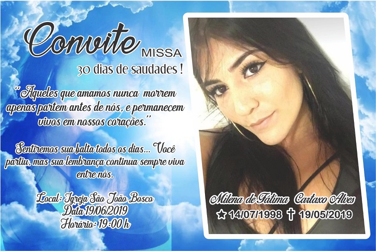 A família da jovem Milena de Fátima Cartaxo Alves convida para a missa de 30º dia, que acontecerá no dia 19 de junho, próxima quarta-feira, às 19 h na Paróquia de São João Bosco, em Cajazeiras.