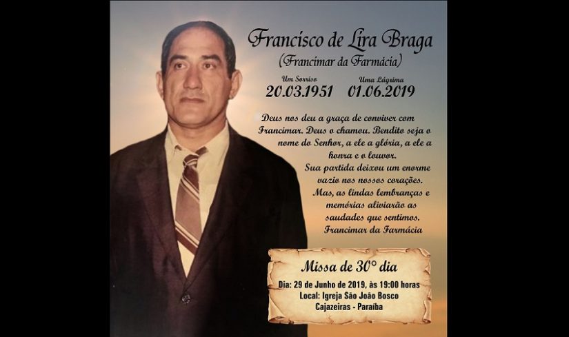 A família de Francisco de Lira Braga, conhecido como Francimar da Farmácia, convida para a missa de 30º dia, em sua memória, que acontecerá no dia 29 de junho, às 19 h na Paróquia de São João Bosco, em Cajazeiras.