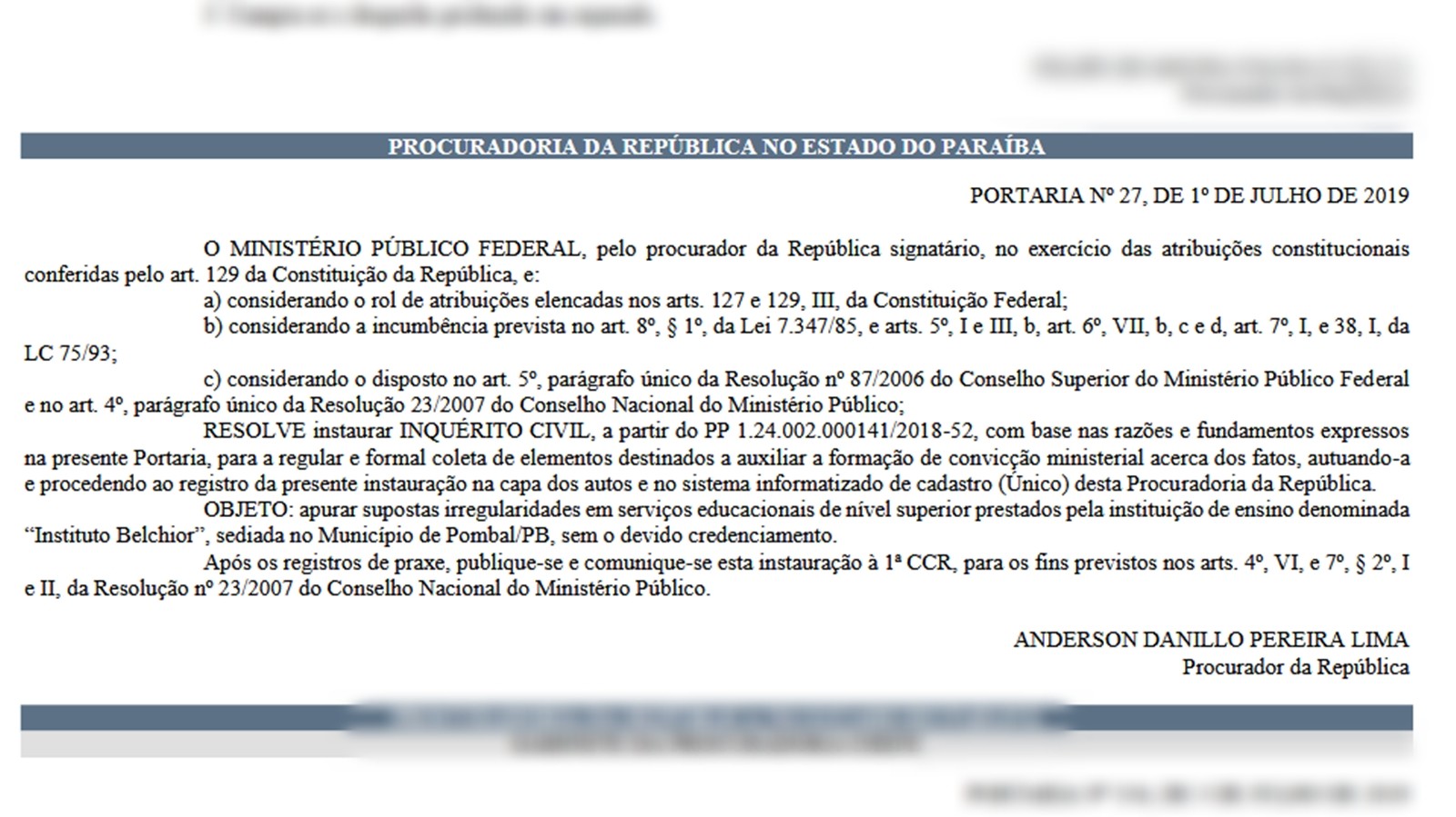 Conforme publicação do MPF, assinada pelo procurador Anderson Danillo Pereira Lima, a instituição de ensino, identificada como Instituição Belchior, foi denunciada por oferecer serviços educacionais de nível superior sem o devido credenciamento. A denúncia em questão foi apresentada em maio de 2018 na procuradoria da República na cidade de Sousa.