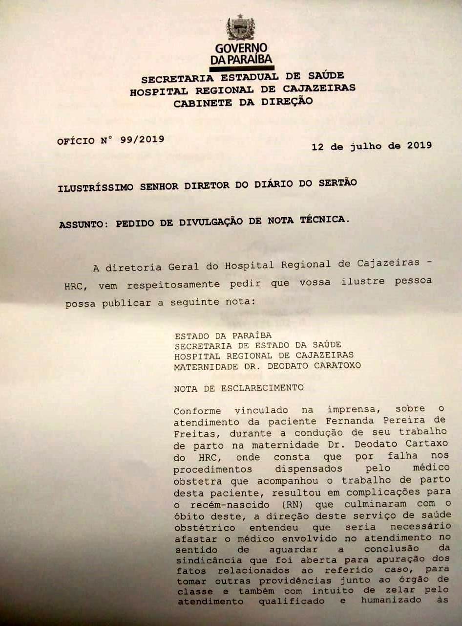 A direção do Hospital Regional de Cajazeiras (HRC) informou, através de nota enviada ao Diário do Sertão, que o médico João Fábio foi afastado das suas funções no hospital até que se conclua a sindicância que apura o caso da jovem que teve complicações durante o parto na Maternidade Dr. Deodato Cartaxo e perdeu seu filho 12 dias depois na UTI Neonatal da Maternidade de Patos.