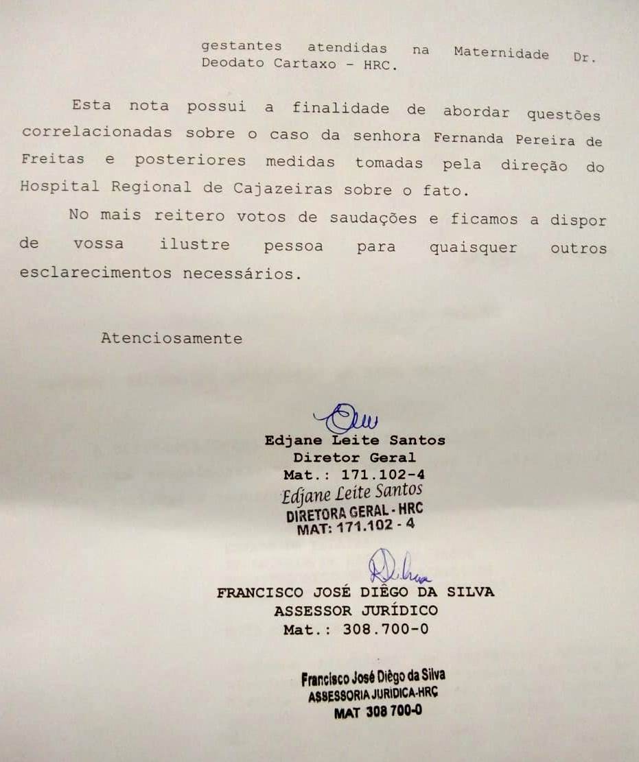 Na nota, a direção do HRC diz que “entendeu que seria necessário afastar o médico envolvido no atendimento no sentido de aguardar a conclusão da sindicância que foi aberta para apuração dos fatos relacionados ao referido caso, para tomar outras providências junto ao órgão de classe e também com intuito de zelar pelo atendimento qualificado e humanizado às gestantes atendidas na Maternidade Dr. Deodato Cartaxo – HRC”.