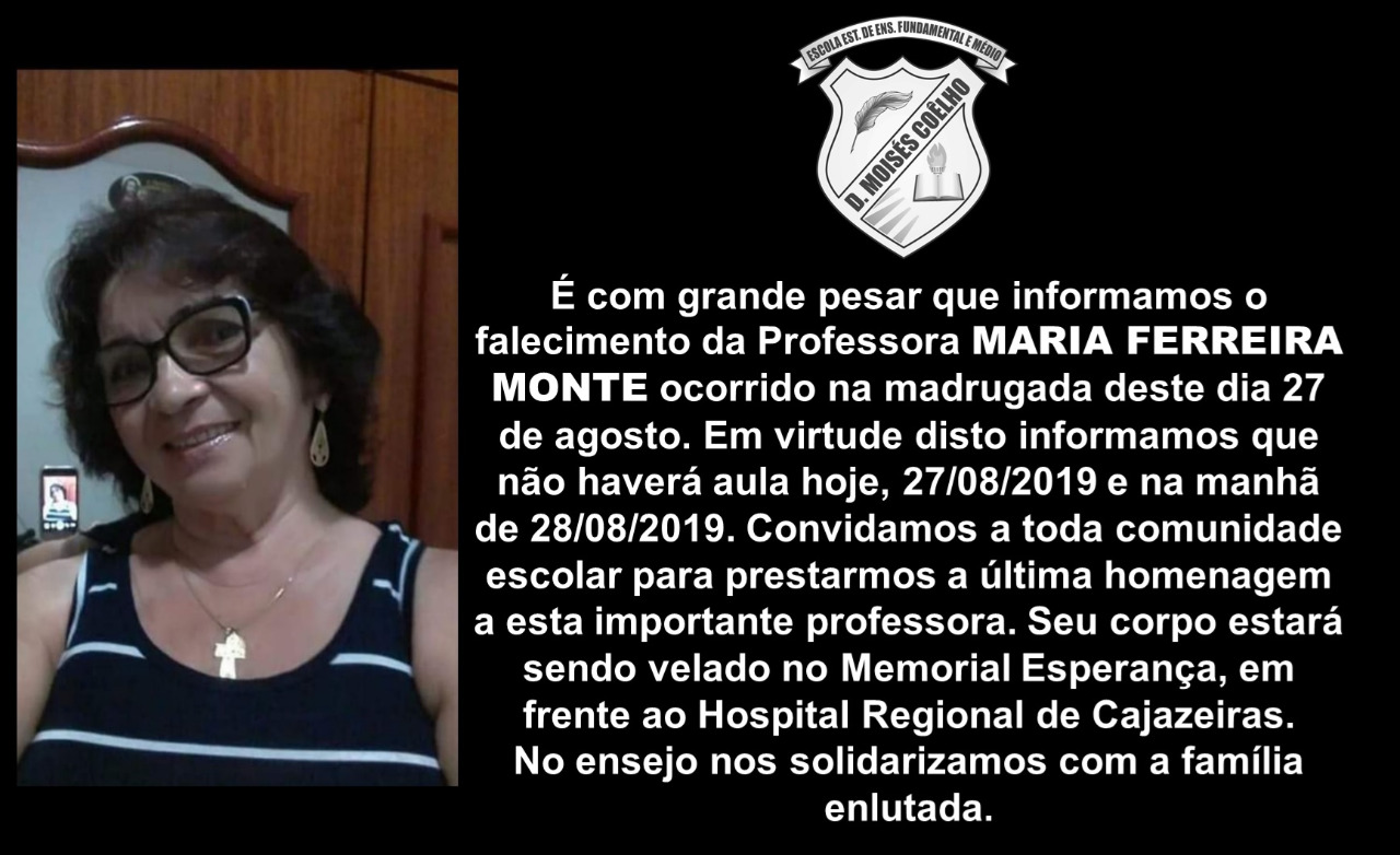 Maria era professora do Colégio Dom Moisés Coelho, que emitiu nota de pesar à família e suspendeu as aulas nesta terça-feira para prestar as últimas homenagens a educadora.