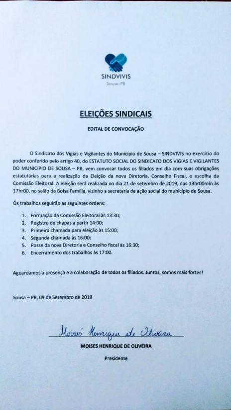 O Sindicato dos Vigias e Vigilantes do Município de Sousa (SINDIVIVIS), divulgou nesta terça-feira (10) um edital de convocação de todos os filiados para realização da Eleição da Nova Diretoria, Conselho Fiscal e seleção da Comissão Eleitoral.