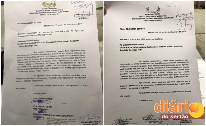 Com o secretário de Infraestrutura e Recursos Hídricos, Deusdete Queiroga, os parlamentares protocolaram pedido de pavimentação de trecho da estrada que liga Marizópolis ao Monte Sinai, espaço religioso nos arredores da cidade, que já é reconhecido ponto turístico do município e abriga e recebe visitantes de todo o Brasil.