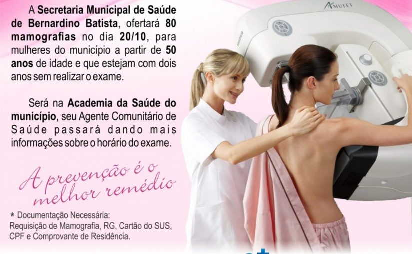 A Secretaria Municipal de Saúde de Bernardino Batista, ofertará 80 mamografias no dia 20/10, (domingo) com início às 8:00 horas para mulheres do município a partir de 50 anos de idade e que estejam com dois anos sem realizar o exame.