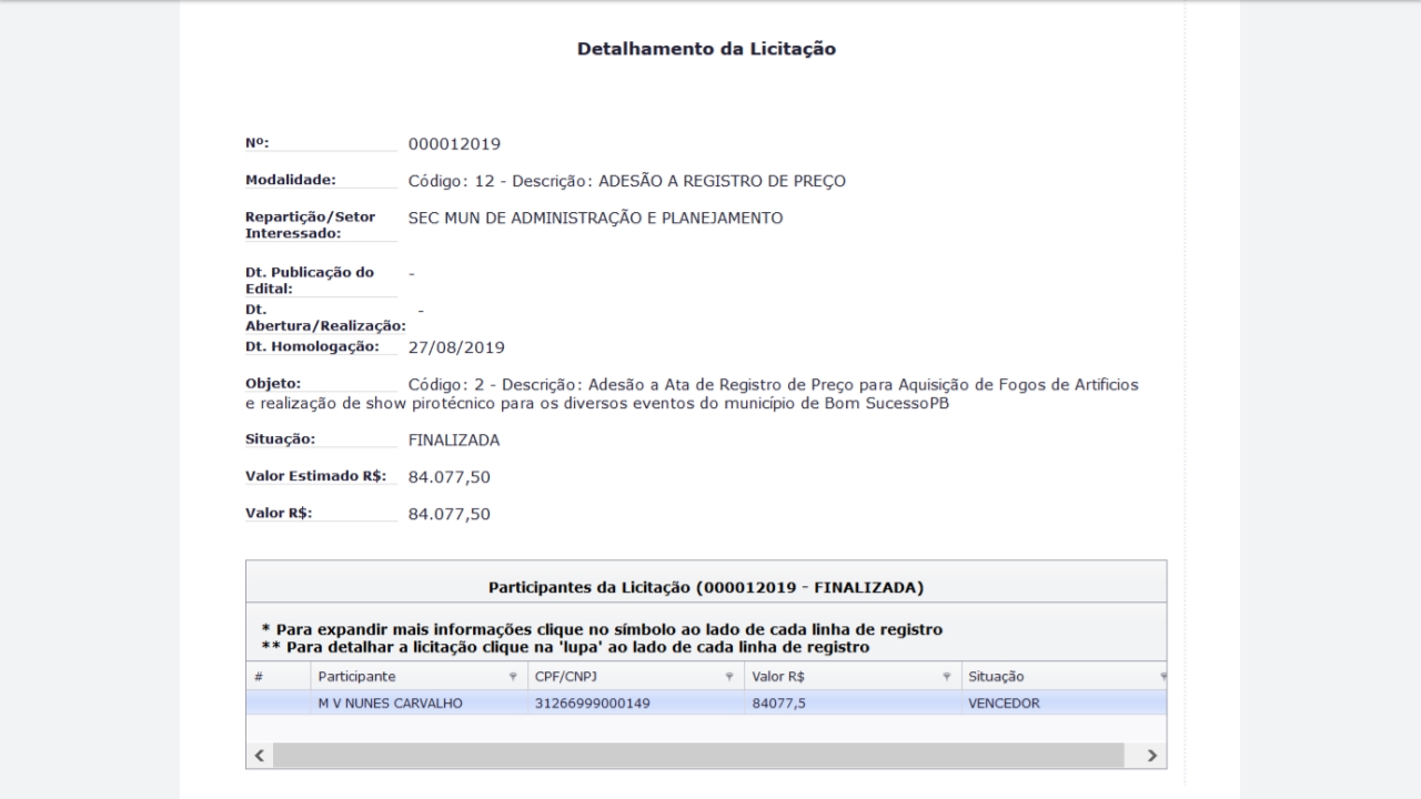 A prefeitura de Bom Sucesso, no Sertão da Paraíba licitou no mês de agosto deste ano, R$ 84.077,50 para aquisição de fogos e artifícios.