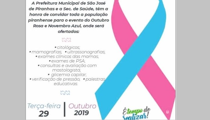 A Prefeitura de São José de Piranhas e a Secretaria Municipal de Saúde convidam a população para participar de um evento alusivo ao Outubro Rosa e Novembro Azul, que será realizado nesta terça-feira, dia 29 de outubro, a partir das 7h30min da manhã na Policlínica Romeu Menandro Cruz.