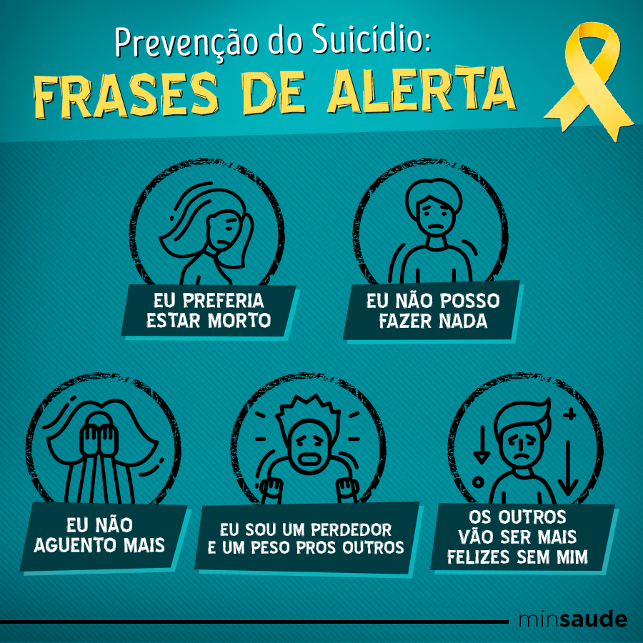 As pessoas sob risco de suicídio costumam falar sobre morte e suicídio mais do que o comum, confessam se sentir sem esperanças, culpadas, com falta de autoestima e têm visão negativa de sua vida e futuro. Essas ideias podem estar expressas de forma escrita, verbal ou por meio de desenhos