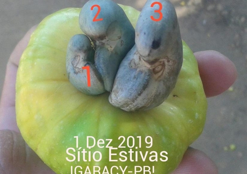 Em um cajueiro na propriedade do aposentado João Vitor da Silva, conhecido por Lelê de Zumba, no Sítio Estivas, município de Igaracy, Sertão da Paraíba nasceu um caju com três castanhas.