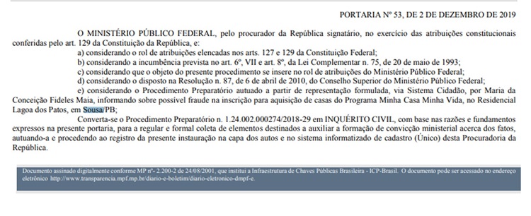 Segundo o MPF, a investigação ocorrerá baseada em denúncia de uma agricultora, de 50 anos. Ela alega que foi inscrita junto ao município de Sousa no programa Minha Casa Minha Vida, em 2012. A casa a que ela teria direito está localizada no Residencial Lagoa dos Patos.