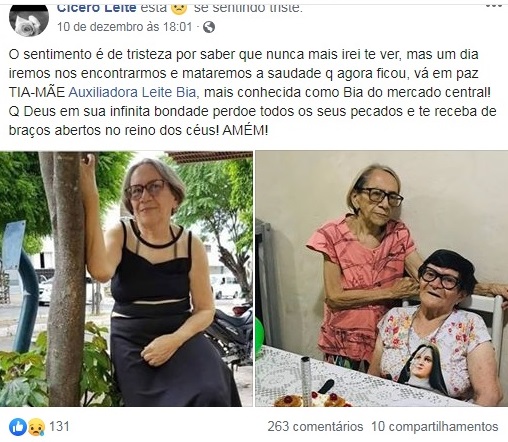 Nas redes sociais, os amigos lamentaram a morte de uma das comerciantes mais antigas da cidade de Cajazeiras, no Sertão da Paraíba.