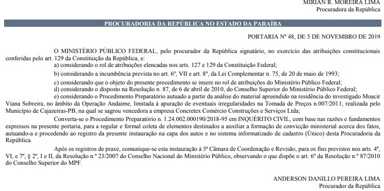 Após análise de documentação apreendida em residência durante uma das fases da Operação Andaime, o Ministério Público Federal na Paraíba instaurou inquérito civil para apurar supostas irregularidades na Tomada de Preços n° 007/2011, realizada pelo município de Cajazeiras, no Sertão do estado.