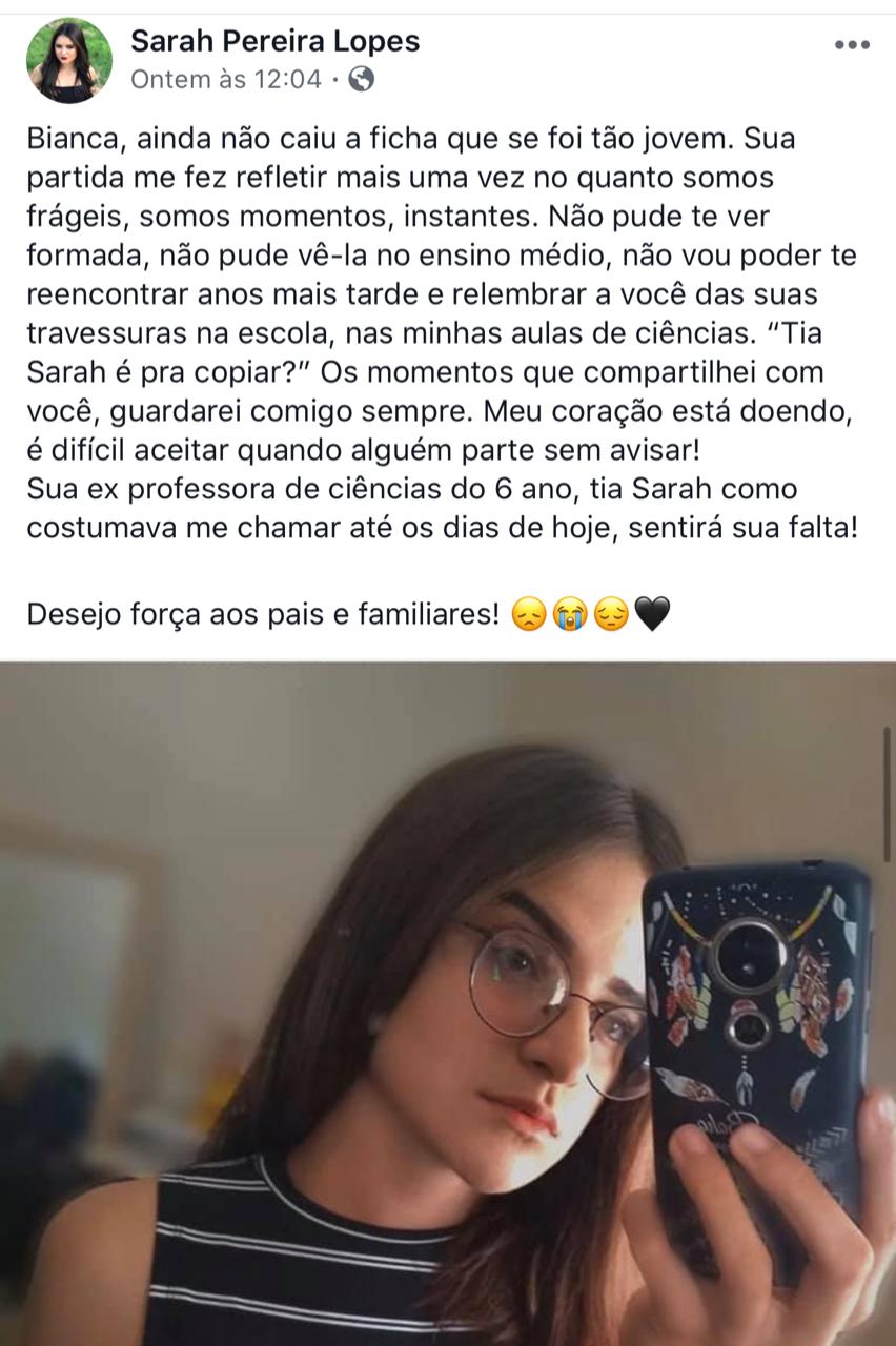 A professora Sarah Pereira Lopes fez uma postagem na sua rede social nessa sexta-feira (13), após a morte da estudante identificada Bianca Dionízio da Silva, de 15 anos. A adolescente foi encontrada morta no Rio Turbina, na cidade de Coremas, Vale do Piancó, na Paraíba.