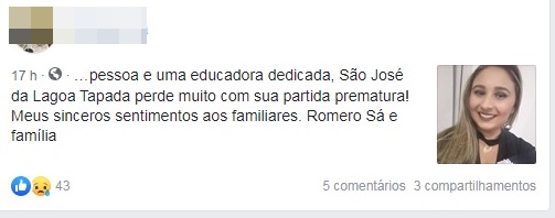 Faleceu na tarde deste sábado (14), a jovem Raquel Sousa, 25 anos, moradora de São José da Lagoa Tapada, Região de Sousa. As primeiras informações dão conta que a jovem faleceu vítima de infarto. O SAMU foi acionado, realizou os procedimentos, mas a estudante já estava em óbito.