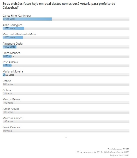Em enquete realizada pelo Portal Diário do Sertão, o jovem médico Carlos Filho (Carlinhos) ficou com 39% na preferência dos internautas para prefeito de Cajazeiras. Carlinhos recebeu 37268 cliques.