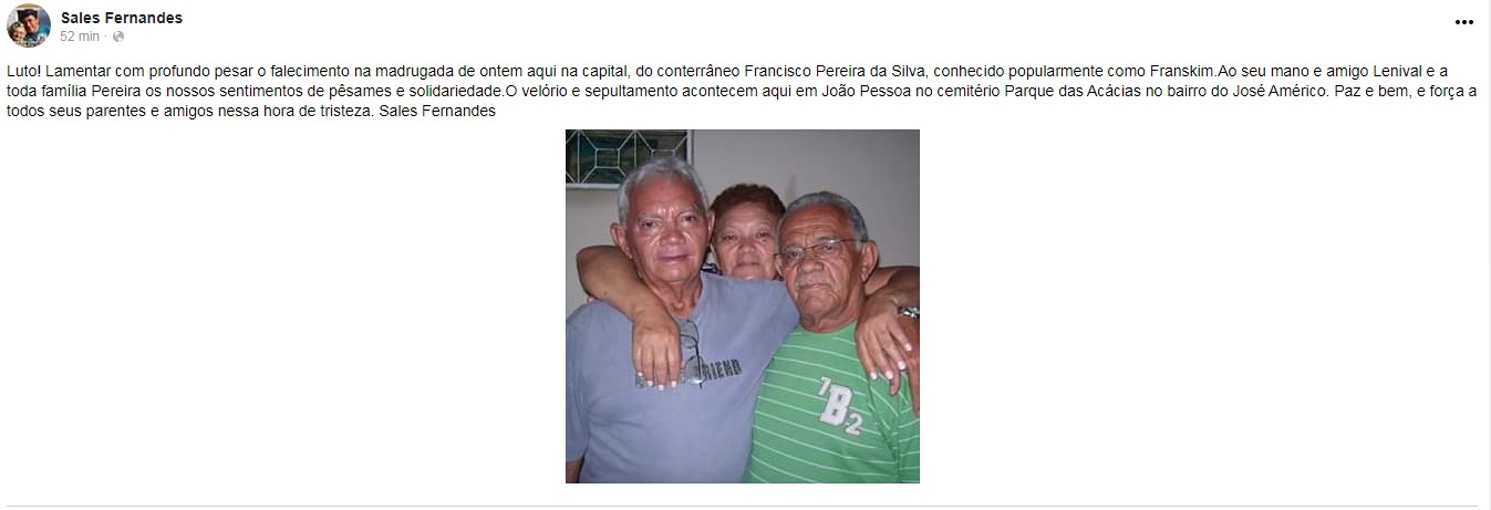 O jornalista cajazeirense, Sales Fernandes usou sua rede social Facebook para se solidarizar com a família enlutada.