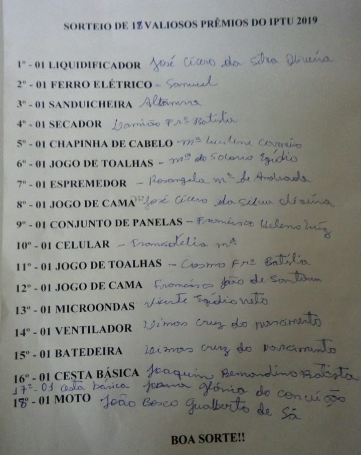 A Secretaria Municipal de Administração e Finanças de Bernardino Batista divulgou nesta quinta-feira (02), os ganhadores do grande sorteio do IPTU premiado/2019.