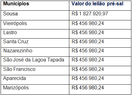 VEJA TAMBÉM Municípios do Vale do Piancó receberam quase R$10 milhões do último leilão do pré-sal de 2019