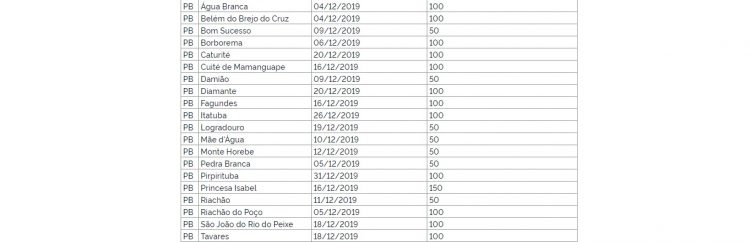 Na Paraíba, 20 cidades foram selecionadas, 10 delas são do Sertão, são elas: Água Branca, Belém do Brejo do Cruz, Bom Sucesso, Diamante, Mãe D´Água, Monte Horebe, Pedra Branca, Princesa Isabel, São João do Rio do Peixe e Tavares.