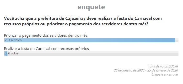 Segundo a enquete, 98% dos telenautas, são contra gastar recursos próprios para fazer festa, enquanto os salários dos servidores da Prefeitura Municipal de Cajazeiras continuam atrasados.