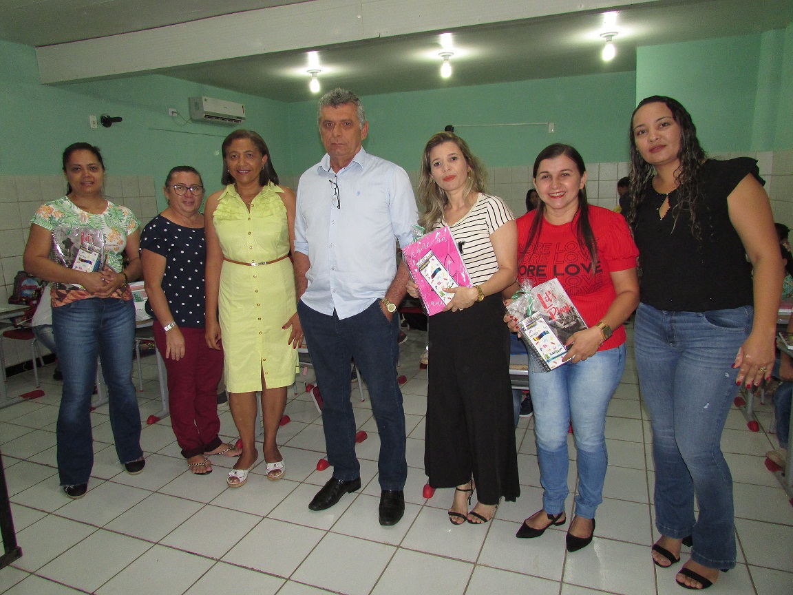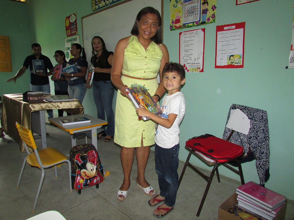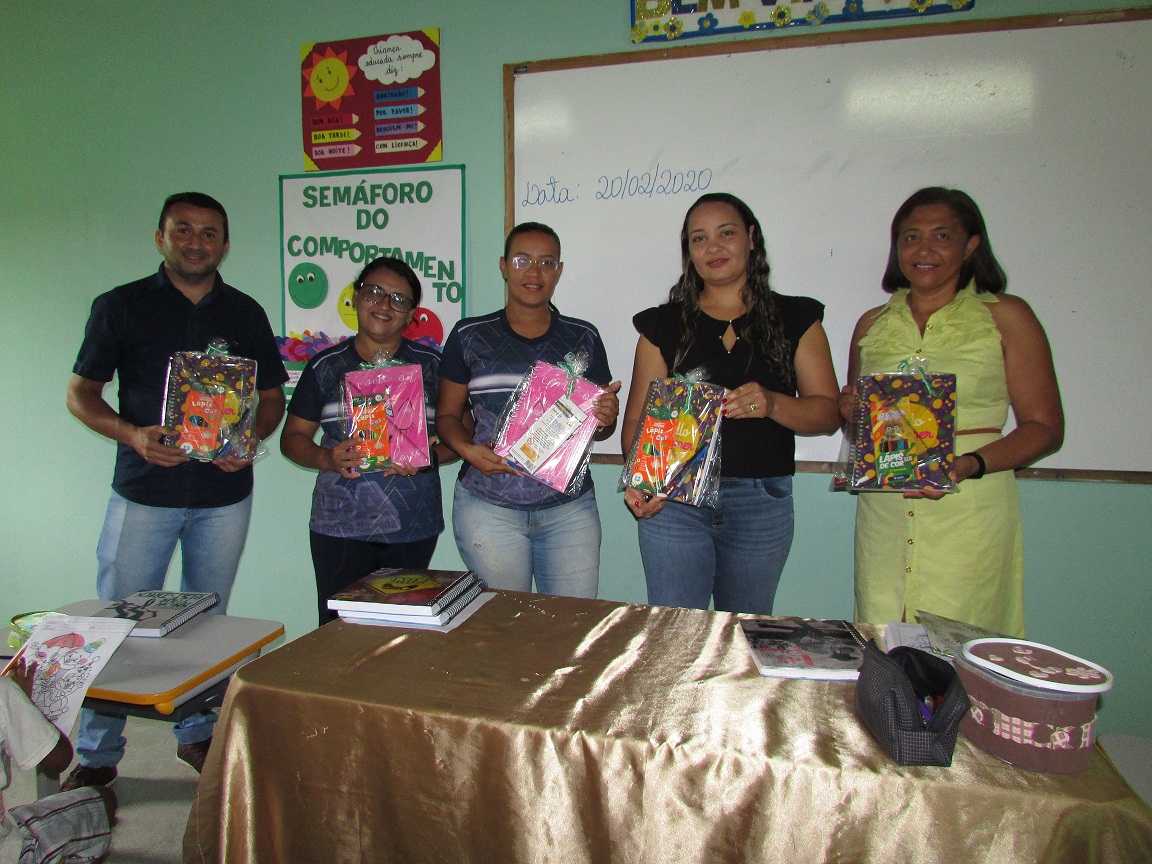 A primeira unidade a receber o material foi a Escola Municipal Professor Mozart Rodrigues. O prefeito participou da entrega, acompanhado da secretária de Educação Cosma Damásio e da adjunta Edjane, diretora, coordenador e professores.