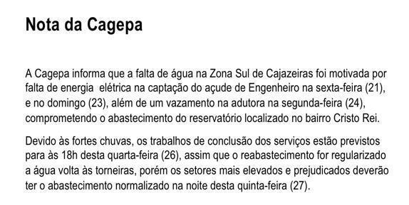 Em nota, a Cagepa disse que a falta d’água na Zona Sul da cidade foi em decorrência da falta de energia elétrica na captação no açude Engenheiro Avidos e por conta de um vazamento no reservatório do Morro do Cristo Rei. Os trabalhos já foram realizados, mas algumas localidades só terão o retorno da água na torneira na noite desta quinta-feira (27).