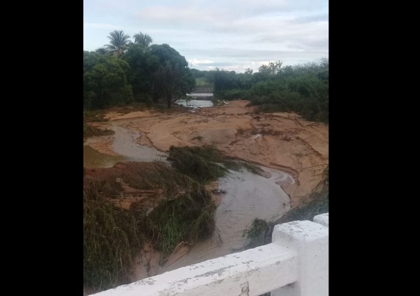 A chuva de mais de 110mm transbordou o açude na comunidade São Mateus, que não aguentou a carga d’água e acabou arrombando, assustando os moradores do local.