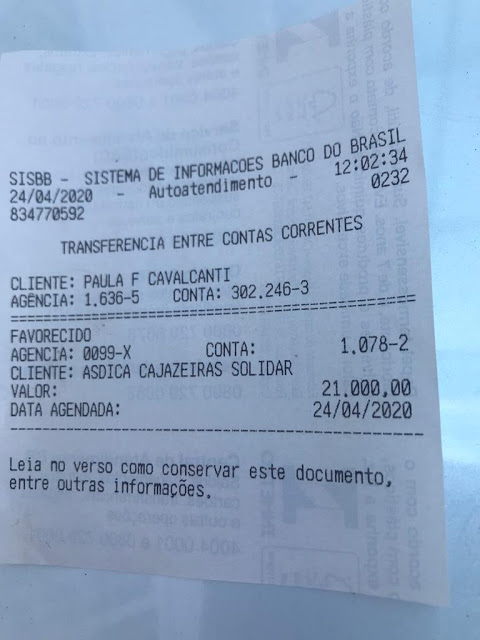 Ainda de acordo com a deputada, a ASDICA foi escolhida para receber o crédito por se tratar de uma entidade idônea. A comunicação à coordenação da Campanha, sobre a transferência, foi feita por meio do ofícío nº.057/2020, datado de 24 de abril de 2020, enviado à ASDICA.