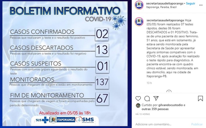 Boletim epidemiológico do dia 05/05 de Itaporanga