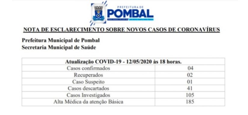 A cidade de Pombal, no Sertão do estado, registou mais 2 casos confirmados de Covid-19.