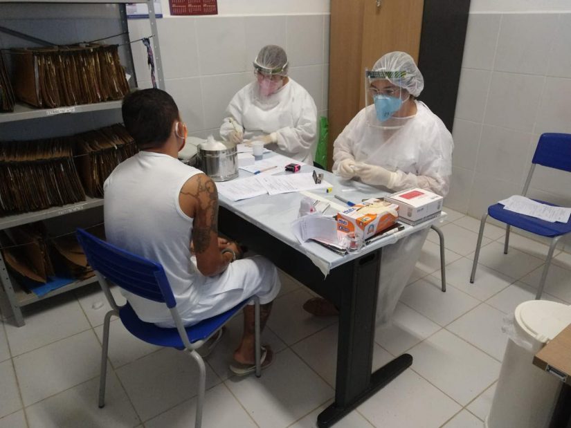 Após o registro de casos do novo coronavírus na Penitenciária Romero Nóbrega, em Patos, no Sertão paraibano, a Secretaria de Administração Penitenciária da Paraíba (Seap-PB) vem intensificando as ações de sanitização e realizou mais 24 testes rápidos da Covid-19 em reeducandos do presídio, dos quais apenas um testou positivo. As novas verificações de testagem foram realizadas nesta quarta-feira (20), após distribuição de máscaras e realização de palestra com a população carcerária.