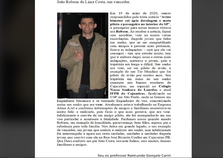 Ex-professor de Piloto cajazeirense presta homenagem nas redes sociais: ‘Era um exemplo de humildade’