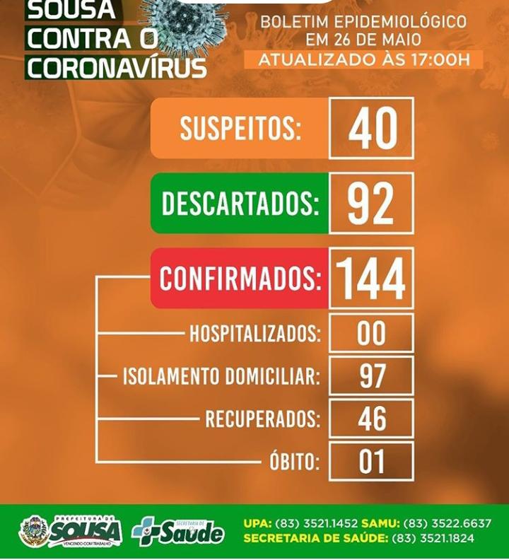 Em Sousa, o comércio continua fechado até o dia 29 de maio de 2020, devido ao aumento especifico dos casos confirmados da doença.
