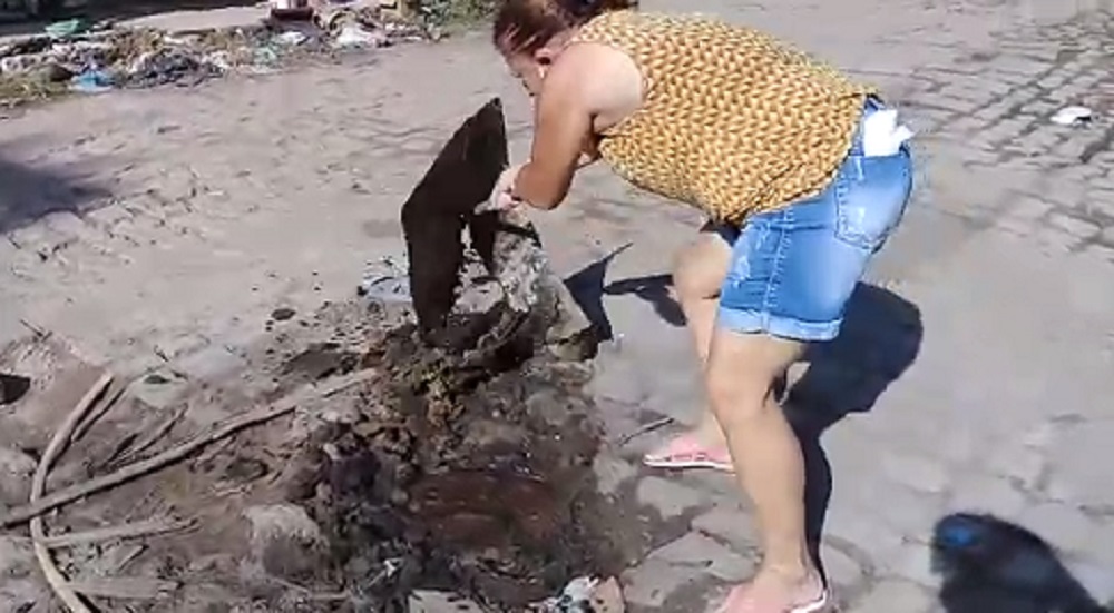 “Aqui tem uma boca de lobo que está cheia de tapurú. Isso aqui não existe, isso dá hepatite. Esse esgoto joga pra rua. Olha a situação que nós estamos. Vem desentupir o esgoto, tira o lixo e bota perto do esgoto. É uma situação triste”’, reclama a moradora.