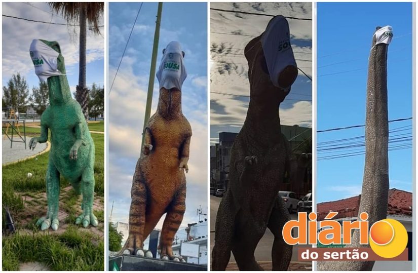 Estátuas dos dinossauros em Sousa ganham máscaras de proteção em alerta contra pandemia de coronavírus