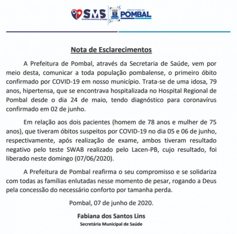Segundo informações divulgadas no perfil oficial do HRP no Instagram esse foi o primeiro óbito confirmado da Covid-19 de Pombal.