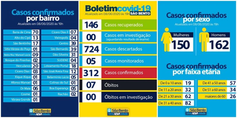 Com a atualização do boletim epidemiológico divulgado nesta segunda-feira (08), São Bento ultrapassou a cidade de Sousa que atualmente está com 294 casos da doença.