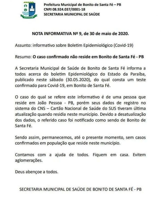 NOTA SOBRE SUPOSTO CASO CONFIRMADO NO MUNICÍPIO DE ACORDO COM O BOLETIM DA SECRETARIA DE ESTADO DA SAÚDE