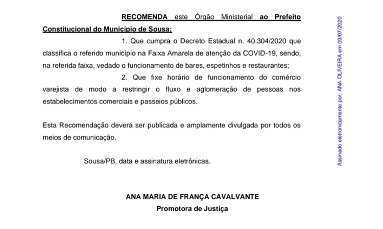 Devido ao aumento nos últimos dias no número de casos de Covid-19 e de óbitos na cidade, a promotora Ana Maria de França Cavalcanti está recomendando que se vete o funcionamento de bares, espetinhos e restaurantes e que fixe um horário de funcionamento para o comércio para restringir o fluxo e aglomeração de pessoas nesses estabelecimentos comerciais.