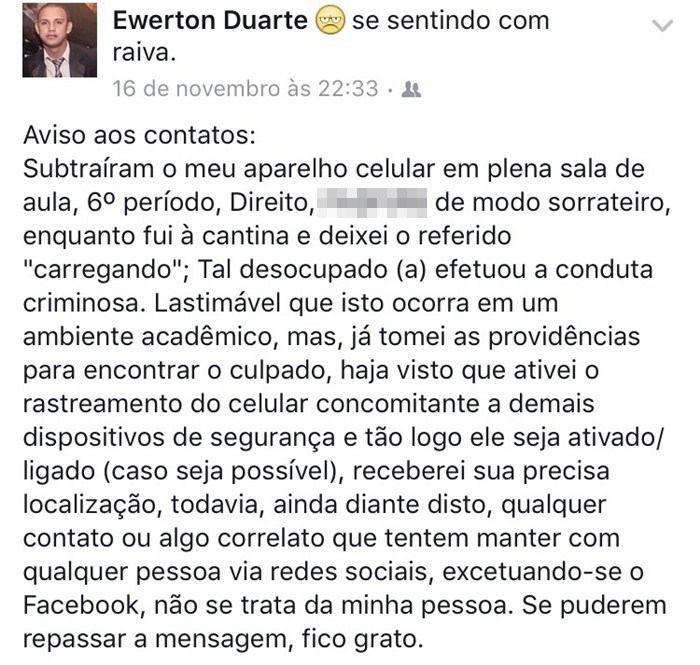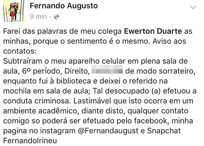 "Primeiro roubaram 50 reais da bolsa de uma aluna. Depois um aluno esqueceu na sala uma mochila com tablete e quem esqueceu achou e não devolveu. Essa semana foi absurdo, furtaram um celular que nosso amigo deixou carregando em sala e o ultimo caso aconteceu na terça-feira (24) furtaram na bolsa de outro amigo", disse uma universitária que preferiu não divulgar o nome.